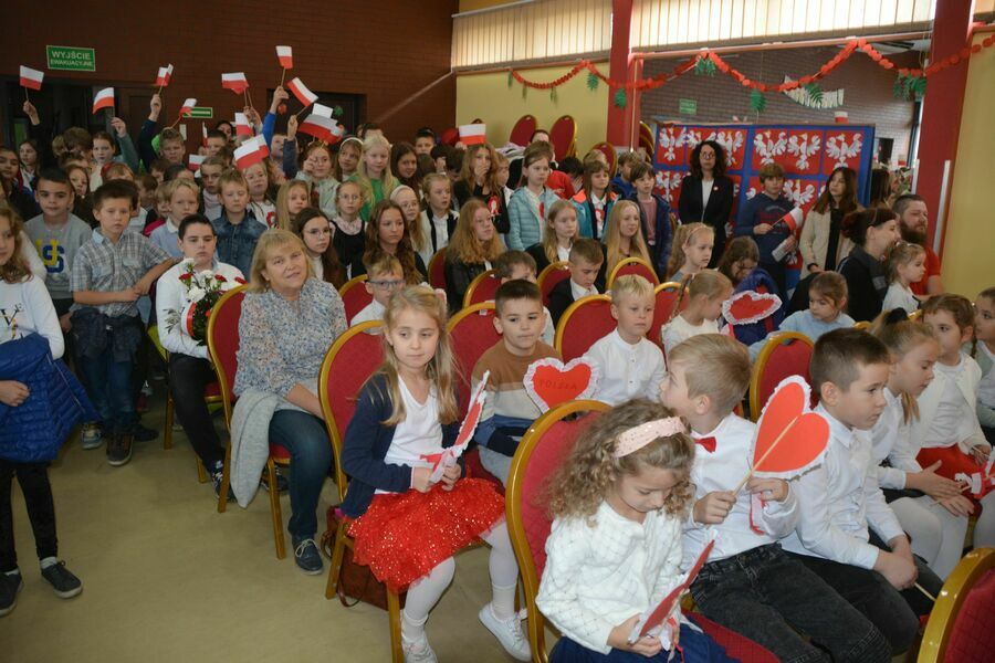 Apel słowno–muzyczny zaprezentowały dzieci z oddziału „O”B, ubrane w barwy narodowe. Odśpiewały Hymn Narodowy, zatańczyły Krakowiaka, wystukiwały na drewnianych patyczkach Rotę w takt muzyki. Były wiersze i piosenki, recytowane i odśpiewane przez najmłodszych. Dzieci do przedstawienia w formie zajęć otwartych przygotowała wychowawczyni, Pani Anna Kachniarz. Występy najmłodszych mieli okazje obejrzeć ich rodzice, zaproszenie na uroczystość. Całość zakończyła się wystąpienie starszych uczniów z Samorządu Uczniowskiego klas 8A i 8B i wręczeniem przygotowanych na tę okazję kwiatów w barwach narodowych.